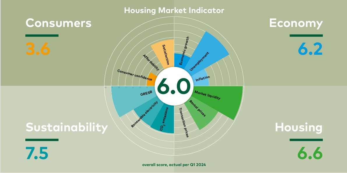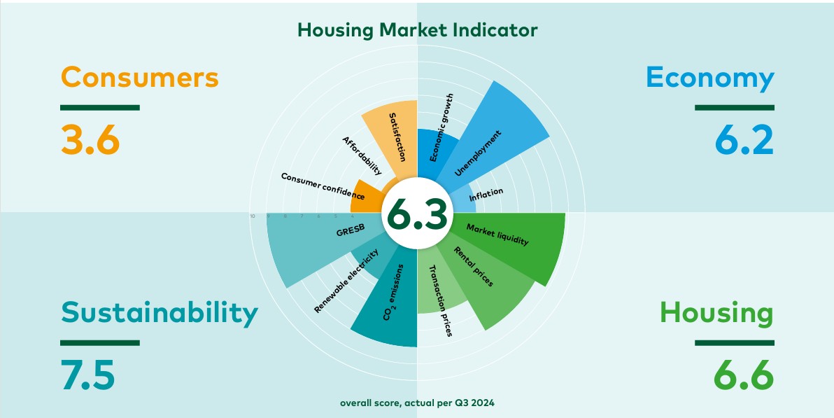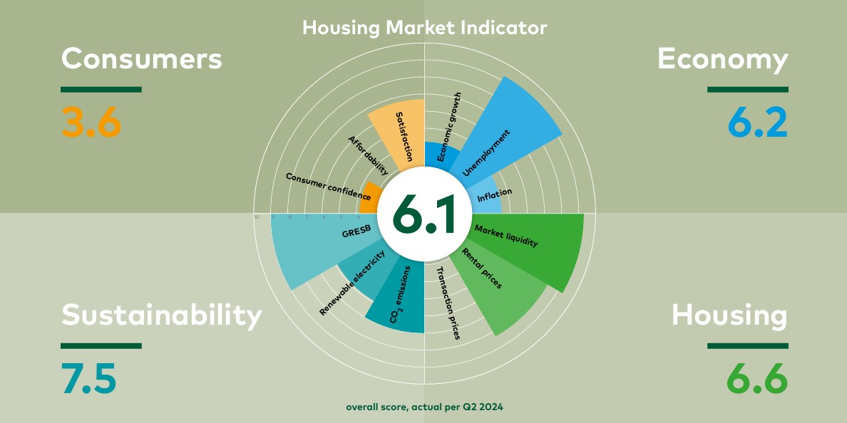 The HMI is made up of 12 key determinants. Not only economic and housing market developments are included, developments in the field of sustainability and the situation of Dutch (residential) consumers are also important factors. The rental housing market and the satisfaction of tenants in the important middle segment of the housing market are reflected in the HMI. This unique composition of factors constitutes an indicator which offers a solid reflection of the elements that are important for Vesteda as a residential investor and for other investors.